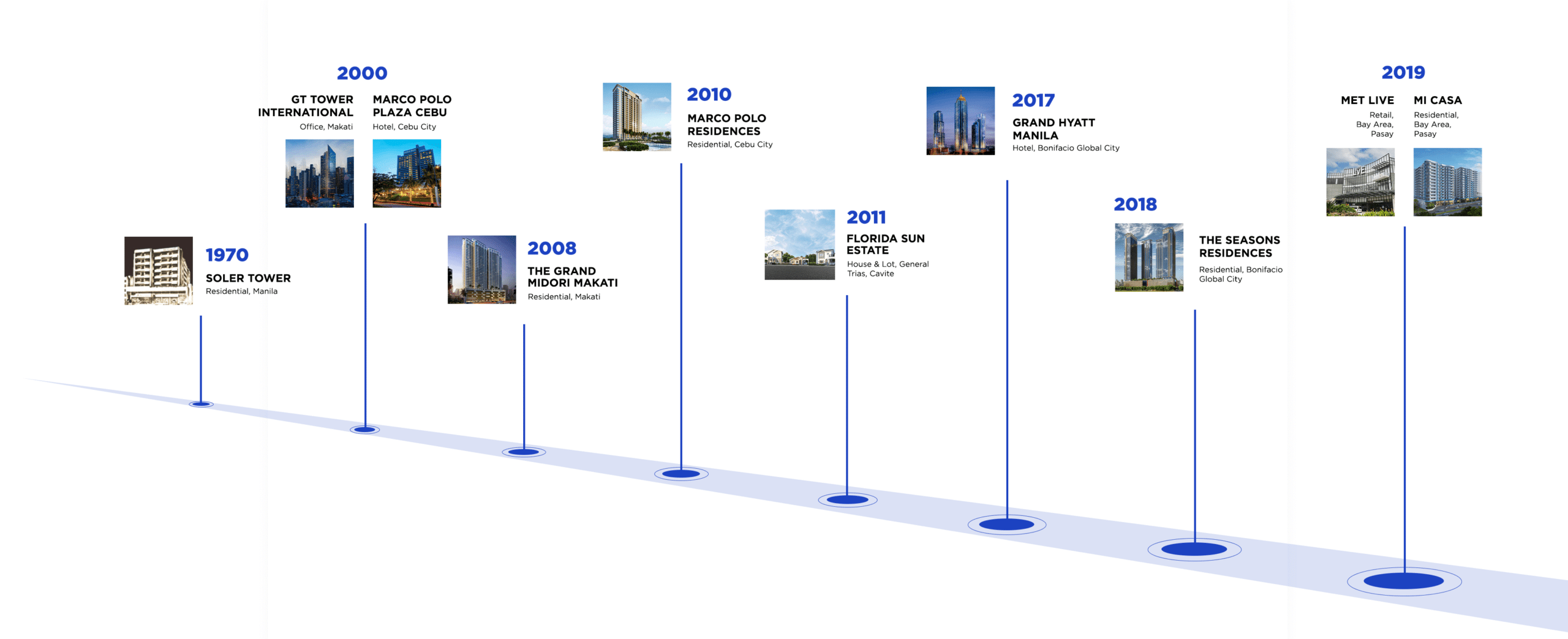 It progressed from single-tower buildings to multiple-tower communities in Pasay, Marikina, and Cavite. The Company also developed residential condominium clusters in new sites in Makati, Manila, and Quezon City, and eventually in Cebu.